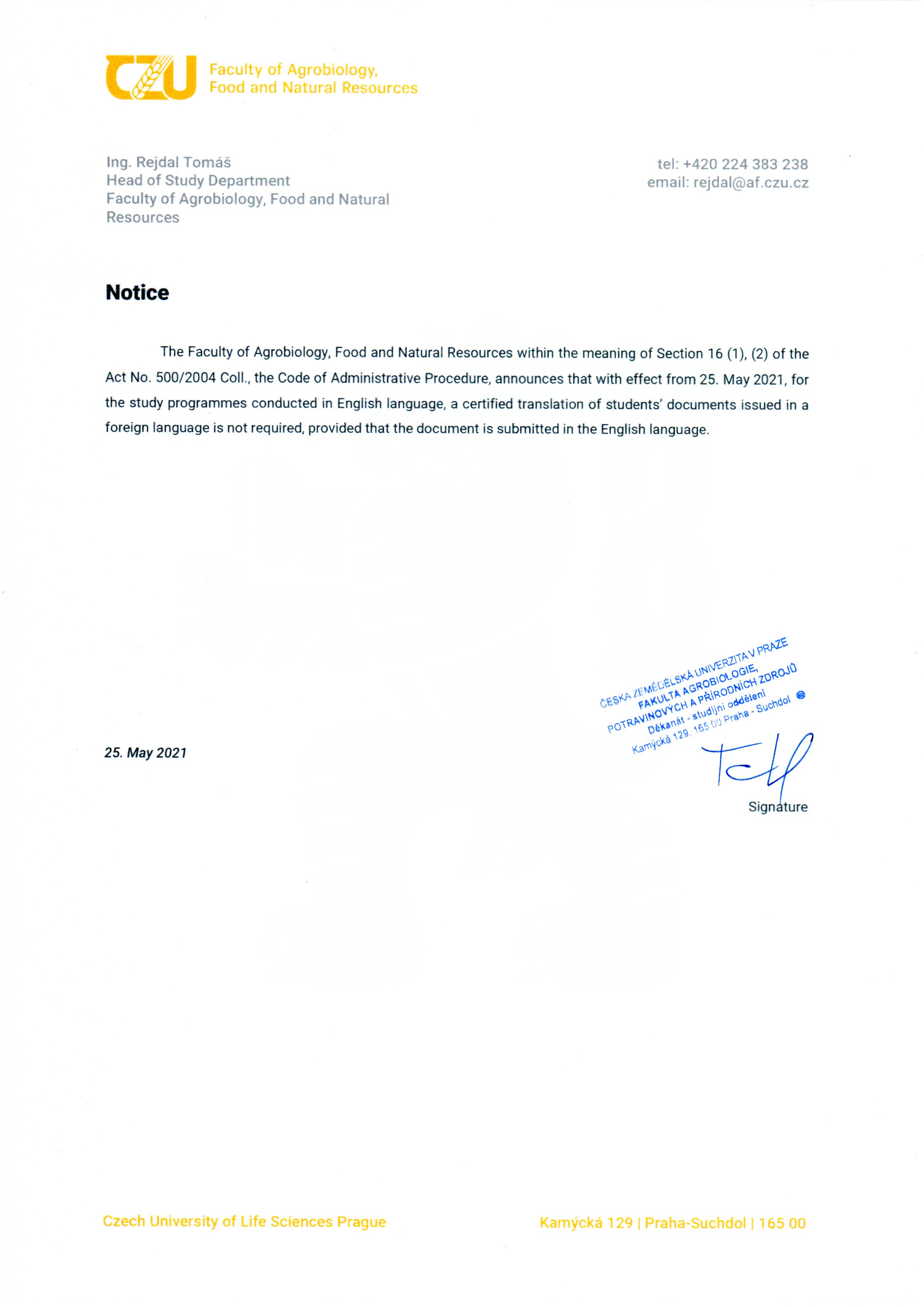 Další platné dokumenty lze nalézt na Studijní dokumenty FAPPZ i na Úřední desce ČZU a Oficiální dokumenty ČZU.