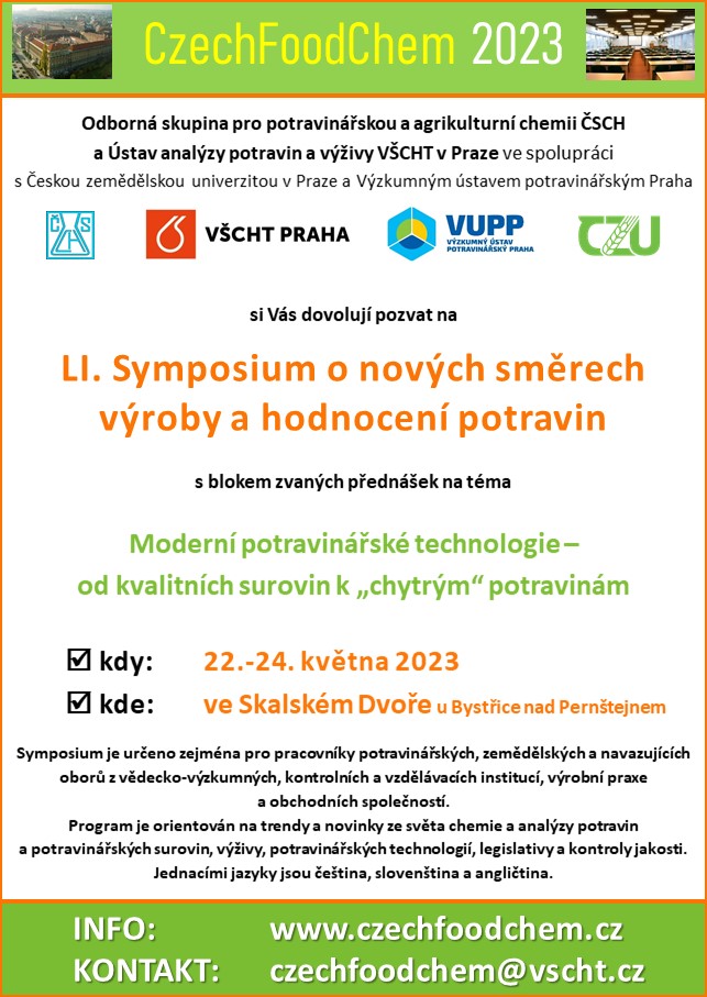 Česká společnost chemická ve spolupráci s VŠCHT Praha, VÚP Praha a ČZU pořádá 51. Symposium CzechFoodChem, které se koná ve dnech 22.-24. května 2023 ve Skalském Dvoře u Bystřice nad Pernštejnem.