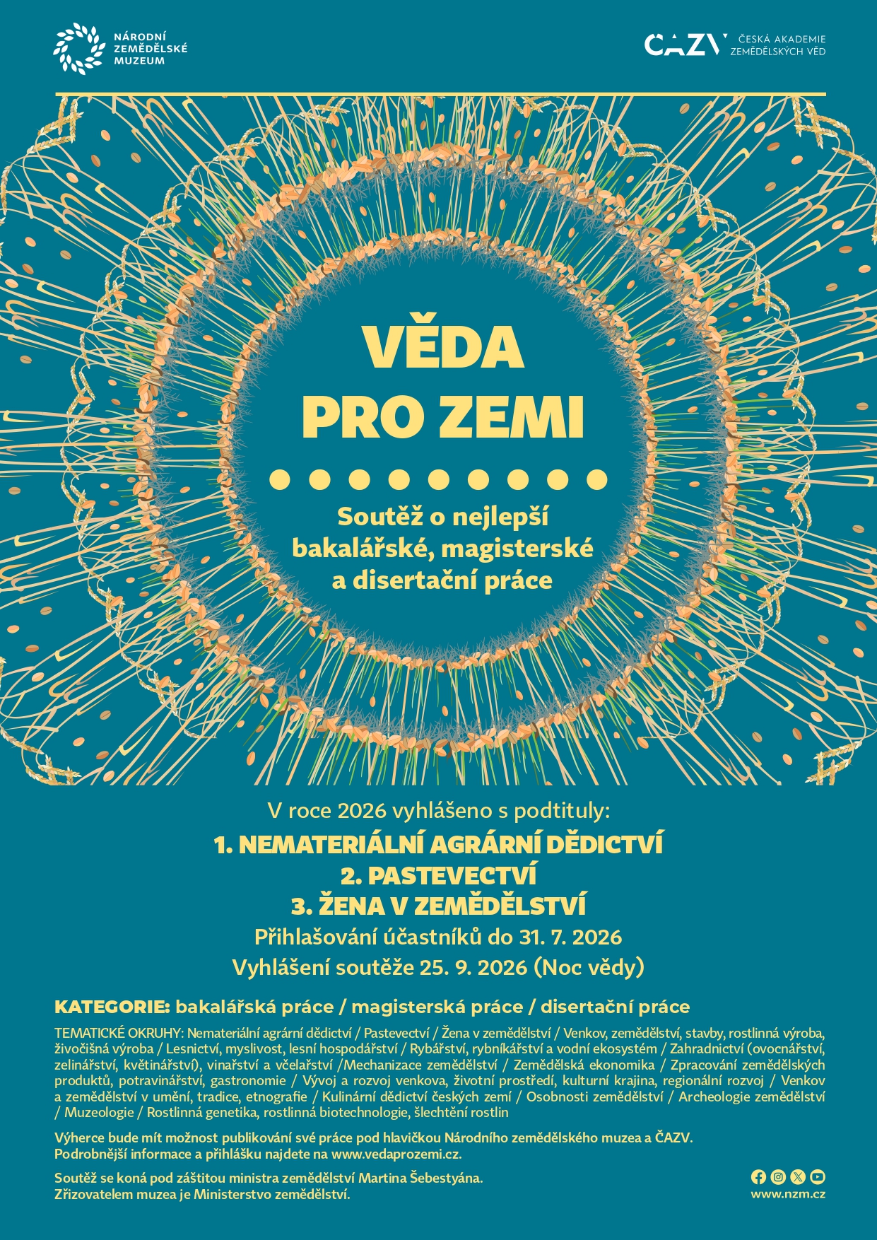 Národní zemědělské muzeum ve spolupráci s Českou akademií zemědělských věd vyhlásily XI. ročník soutěže Věda pro zemi 2026 o nejlepší bakalářské, magisterské a doktorské práce se zaměřením na zemědělství. Soutěž každoročně oceňuje zajímavé absolventské práce z širokého spektra zemědělských oborů a vítězům nabízí také příležitost k publikování v odborném periodiku NZM nebo ČAZV.