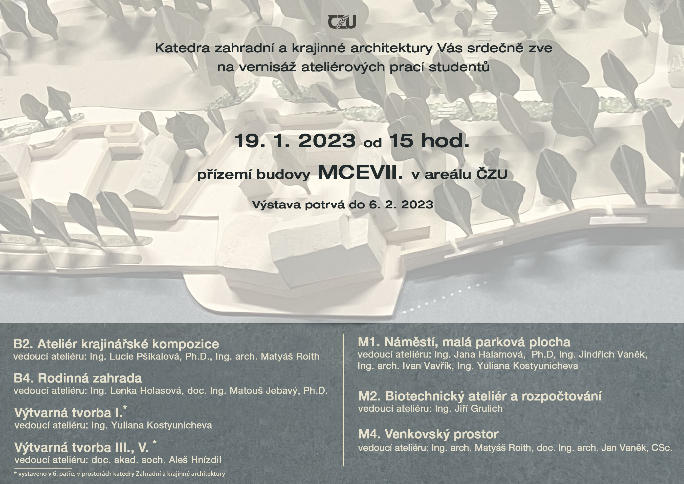 Srdečně zveme zájemce na výstavu studentských ateliérových prací, zpracovaných studenty krajinářské architektury v zimním semestru 2022/23. Výstava proběhne od 19. ledna 2023 do 6. února 2023 v přízemí a 6. patře budovy FAPPZ-D (MCEVII).